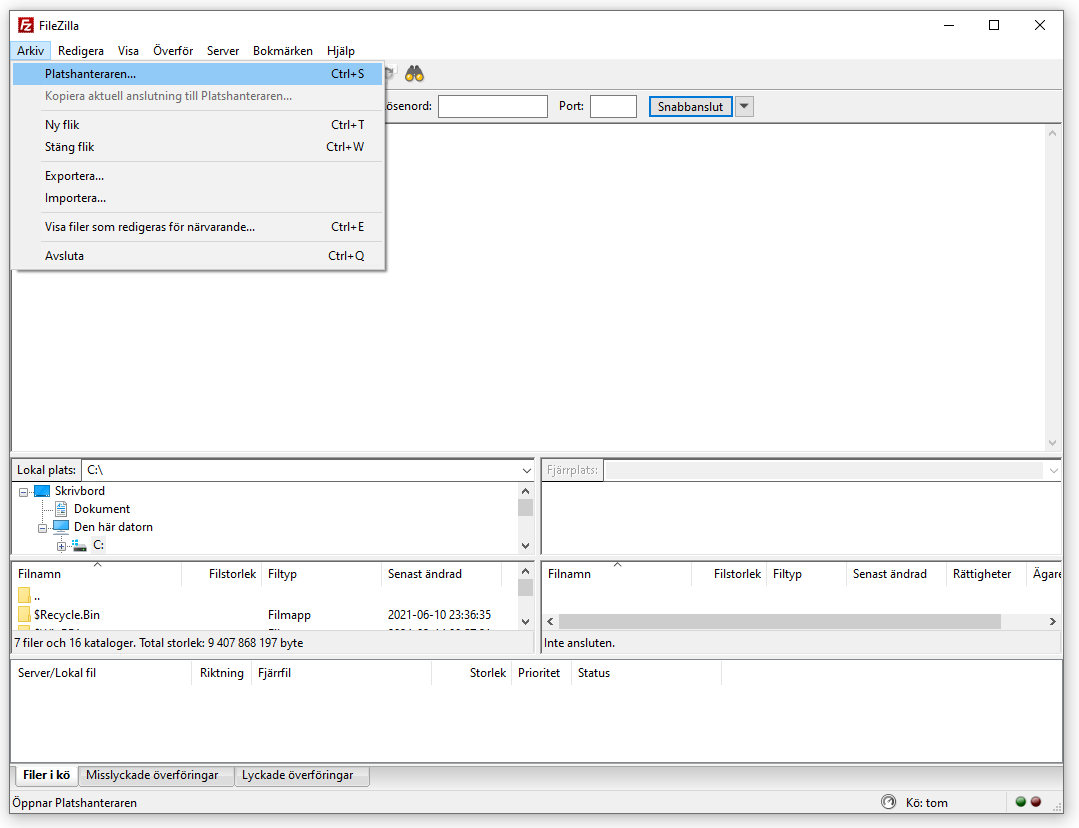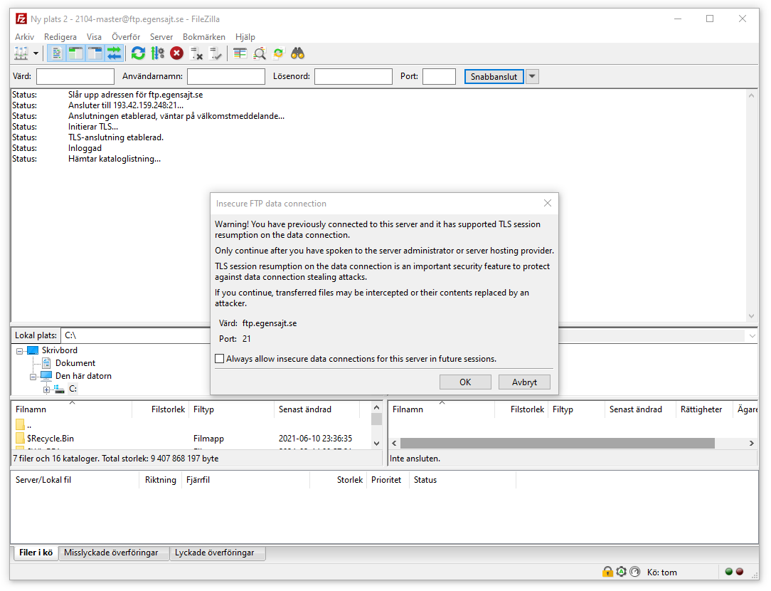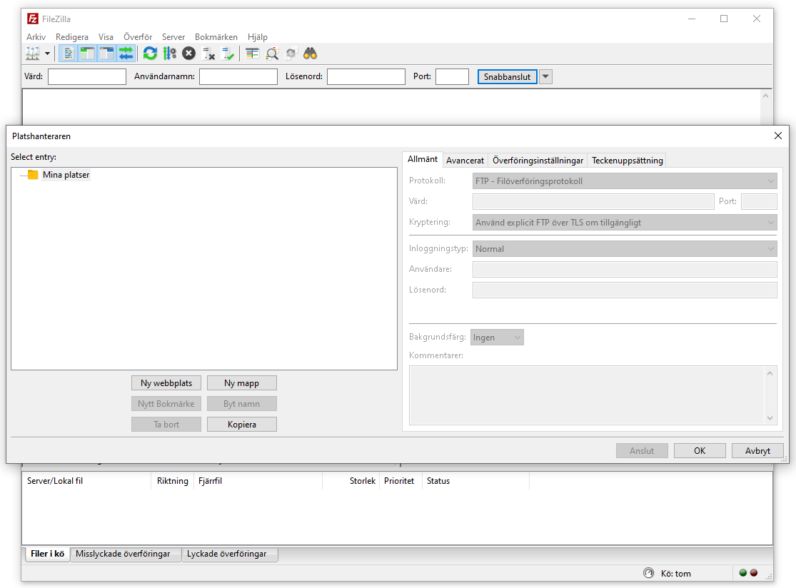 Vi visar hur du kan använda den vanligaste programvaran för FTP som heter FileZilla. Du kan även använda andra programvaror med liknande inställningar. I exemplet nedan använder vi FTP över TLS för god säkerhet. Du kan även välja vanlig osäker FTP vilket inte rekommenderas.