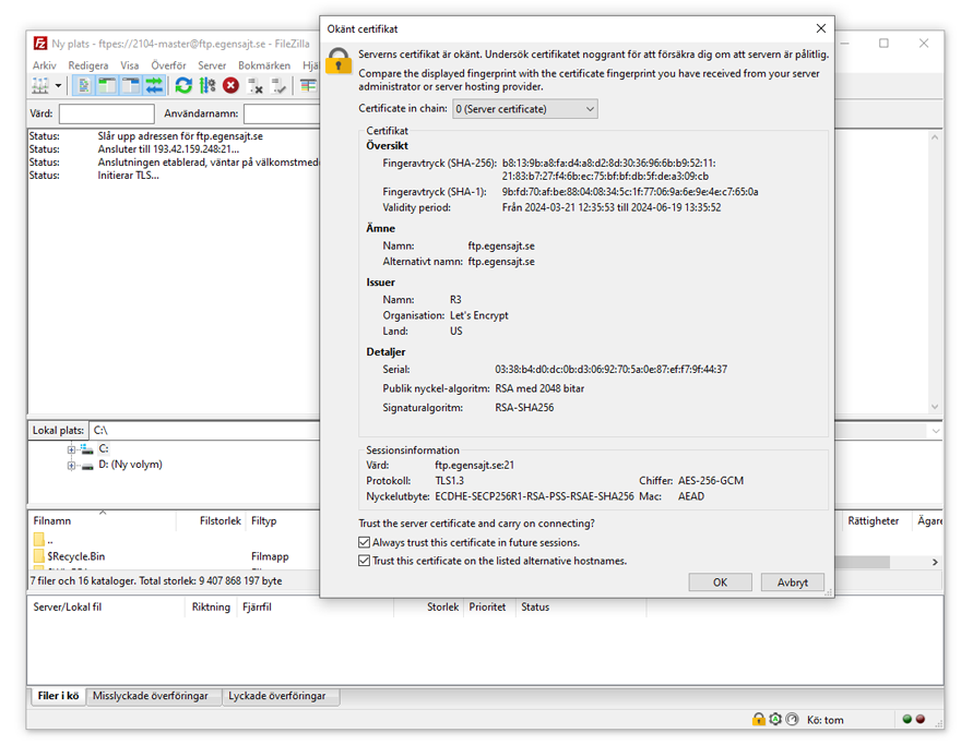 Nu kommer det upp en dialogruta över certifikatet som du kan godkänna och sedan ska du vara uppkopplad mot ditt webbkonto!